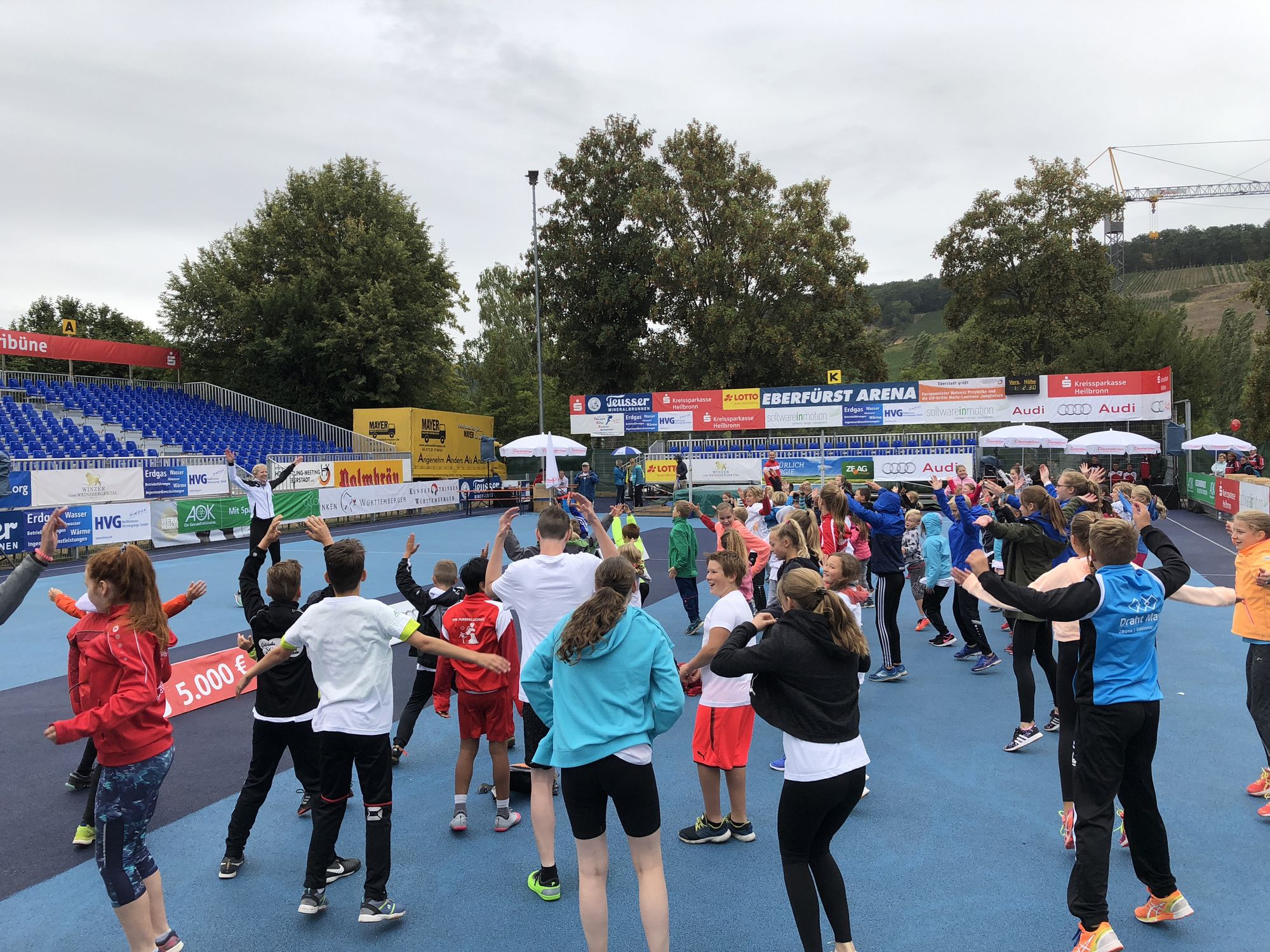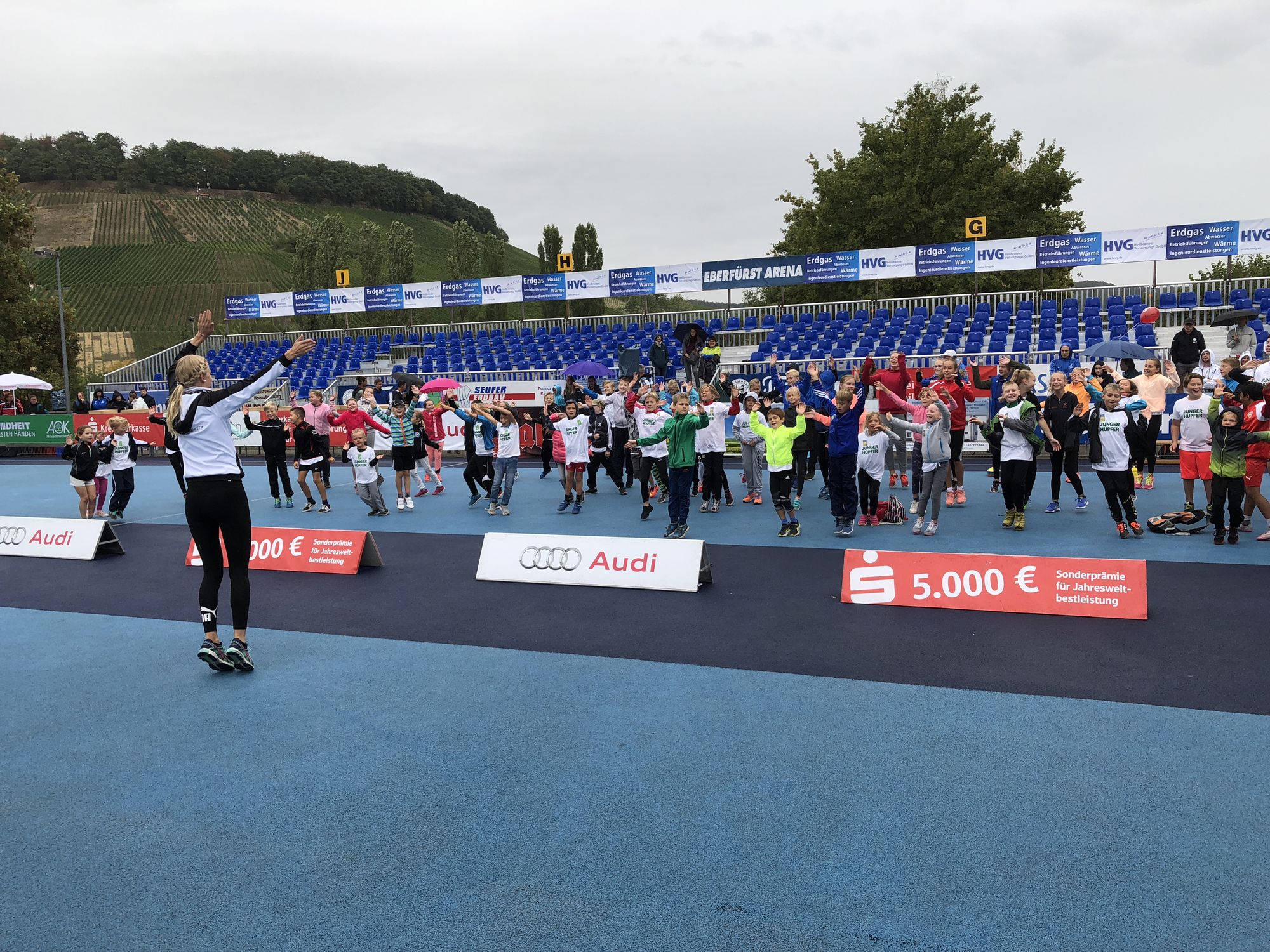 Nach der Begrüßung durch Eberstadts Bürgermeister Stephan Franczak und Frau Bayer von der AOK Bezirksdirektion Heilbronn-Franken ging es direkt mit einem gemeinsamen Warm-Up zusammen mit den Projektleitern von "WLV Kinderleicht-Athletik VOR ORT" Maximiliane Hegemann und Rene Stauß los. Es wurde gehüpft, getanzt und gelacht - außerdem durfte eine lautstarke Laola-Welle natürlich nicht fehlen. Im Anschluss wurde nach Altersklassen aufgeteilt. Die Jugendlichen der Altersklassen U14 und U16 haben sich unter Anleitung von Ex-Hochspringer Volker Wieland und Stefanie Novodomsky direkt in der EberfürstArena ausgetobt. Es gab viel zu erleben für die Jugendlichen: Eine Station zur Kräftigung und allgemeinen Stabilisierung des Rumpfes. Desweiteren eine Station zur Koordination und es wurde natürlich Hochsprung geübt - und das auf der Matte, wo später die Weltstars ebenfalls Ihre Flugshow absolviert haben.