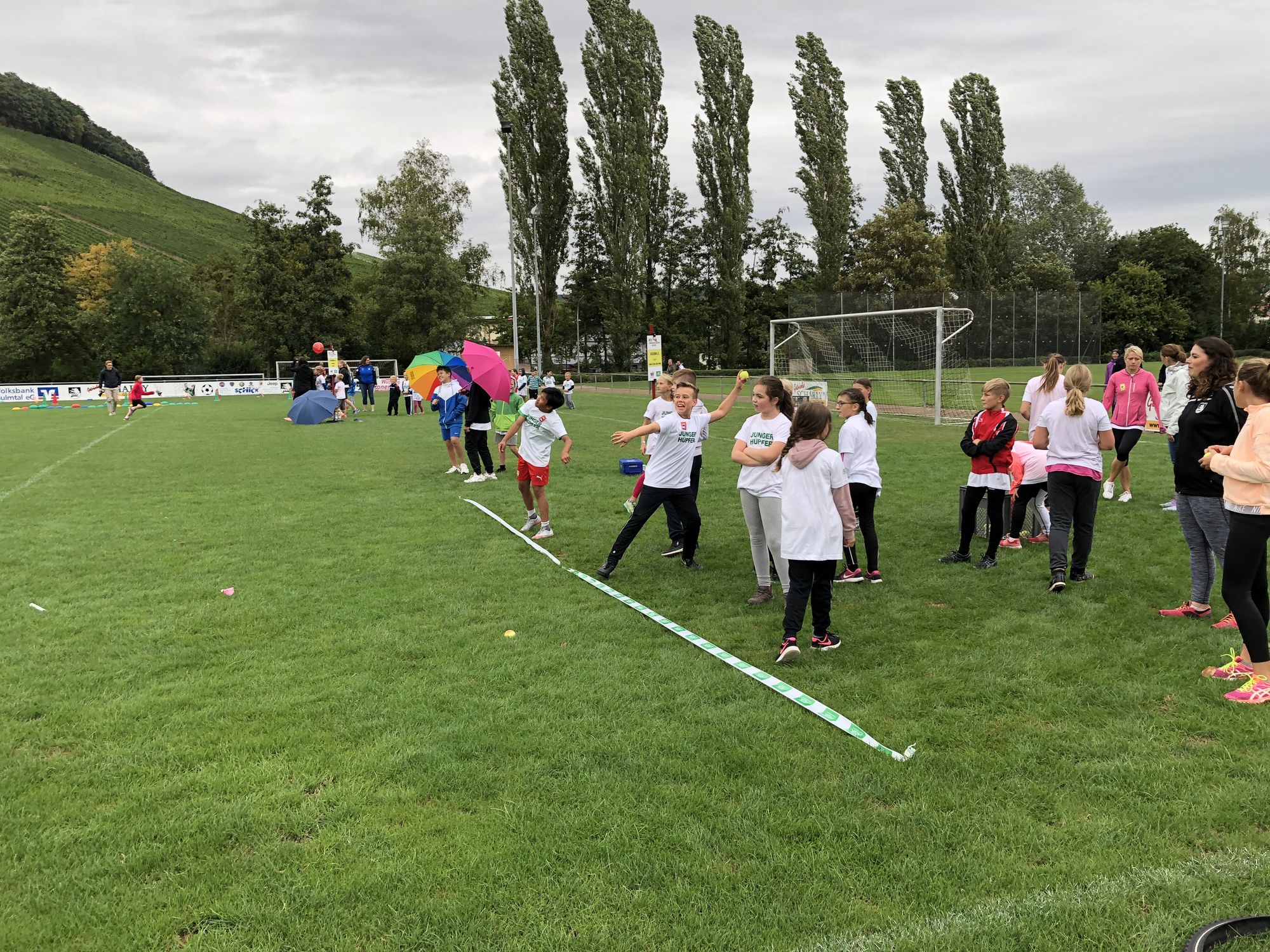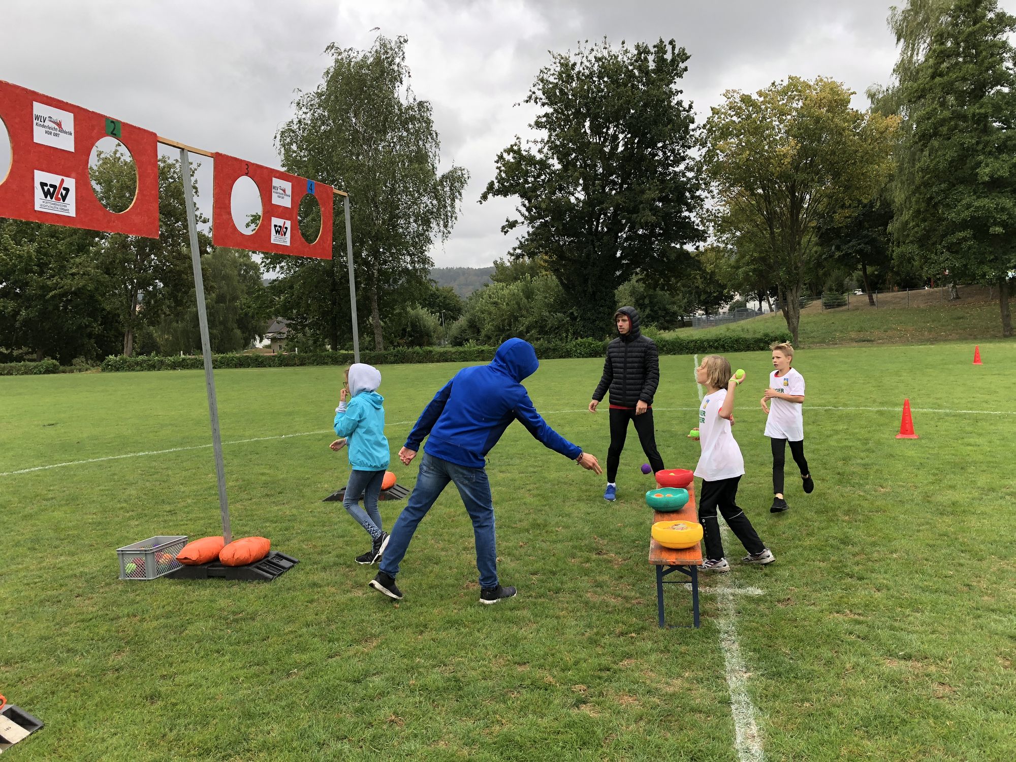 Die Altersklassen der U12 und Jünger haben auf dem angrenzenden Sportplatz die acht Stationen von "WLV Kinderleicht-Athletik VOR ORT" absolviert. Mit Unterstützung von zahlreichen Helfern des VfL Eberstadt und der TSG Heilbronn konnten die rund 70 Kinder viele neue Bewegungserfahrungen sammeln. So war beispielsweise die Biathlon-Staffel für viele ein besonderes Highlight: Hier wurden sehr viele Fähigkeiten der Kinder abgerufen: Nach einer Rolle vorwärts wurde über kleine Hindernisse gesprungen, dann musste durch einen Tunnel gekrochen werden, bevor dann Sandsäckchen auf die roten WLV-Zielscheibe abgefeuert werden durften. Wenn ein Treffer erzielt wurde, dann durfte direkt ohne Strafrunde durch die Fahrradreifenbahn wieder zum Team zurück gerannt werden - wer nicht getroffen hat, musste zunächst eine kleine Strafrunde absolvieren.