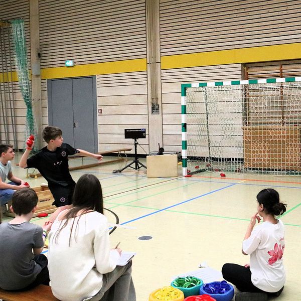 Dafür werfen die Schüler:innen mit einem Sandsäckchen auf ein Handballtor, ein Speedometer misst, wie schnell das Säckchen sein Ziel findet. Motiviert durch die Anfeuerungsrufe des Stationshelfers wuchsen die Schüler:innen über sich hinaus und Geschwindigkeiten von über 70 km/h waren keine Seltenheit.